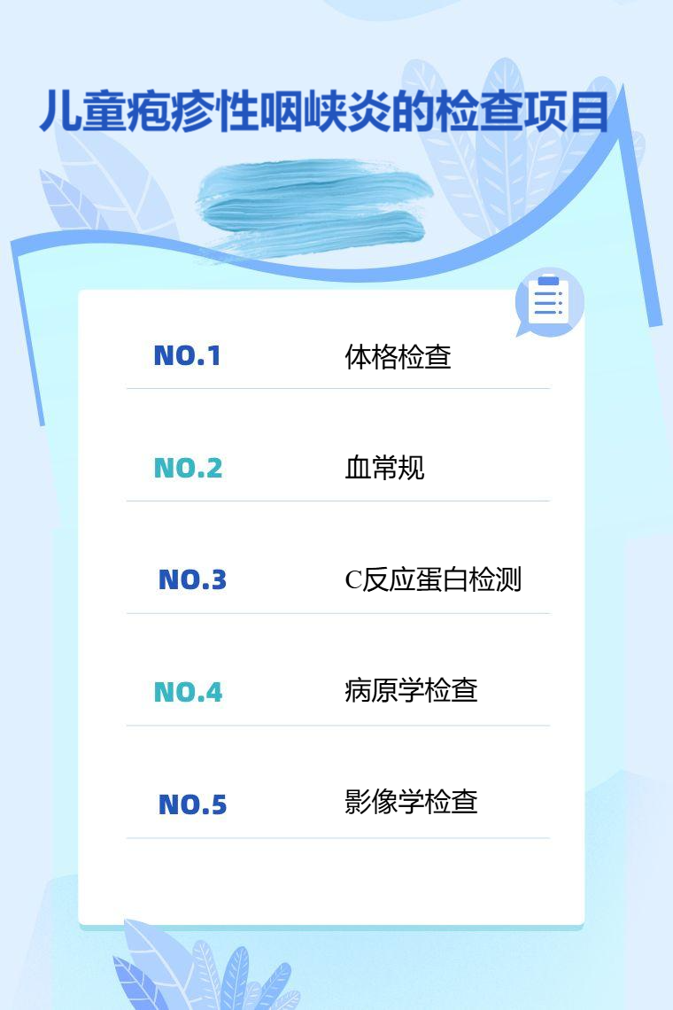 儿童疱疹性咽峡炎的检查项目有体格检查、血常规、C反应蛋白检测、病原学检查、影像学检查等。