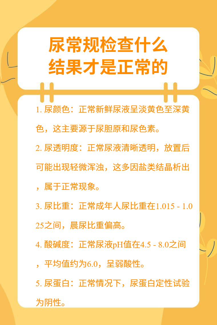 尿常规检查的正常结果涵盖尿颜色、尿透明度、尿比重、酸碱度、尿蛋白等多项指标。
