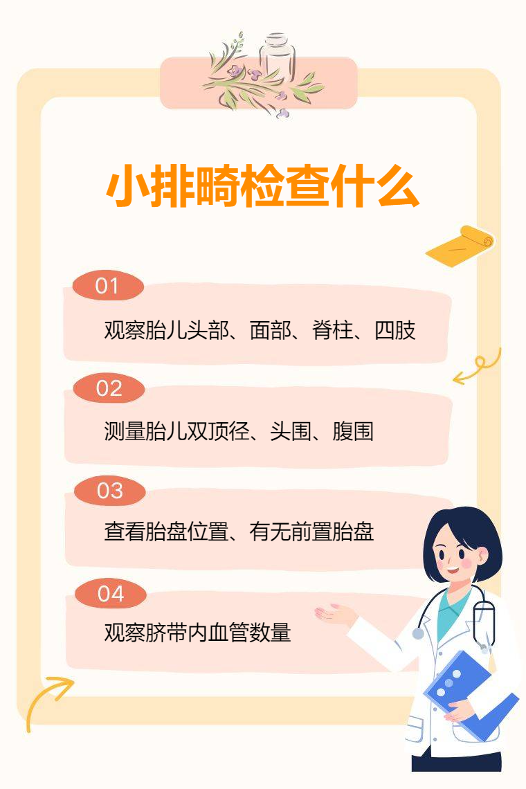 小排畸检查项目包括胎儿解剖结构、胎儿生长发育、胎盘和羊水情况、胎儿附属物等。