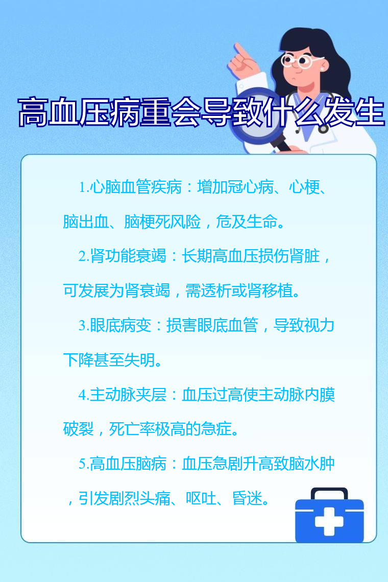 高血压病重会导致心脑血管疾病、肾功能衰竭、眼底病变、主动脉夹层、高血压脑病等。