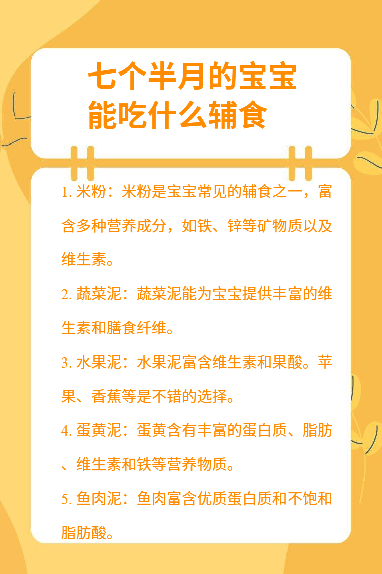 七个半月的宝宝能吃的辅食有米粉、蔬菜泥、水果泥、蛋黄泥、鱼肉泥等。