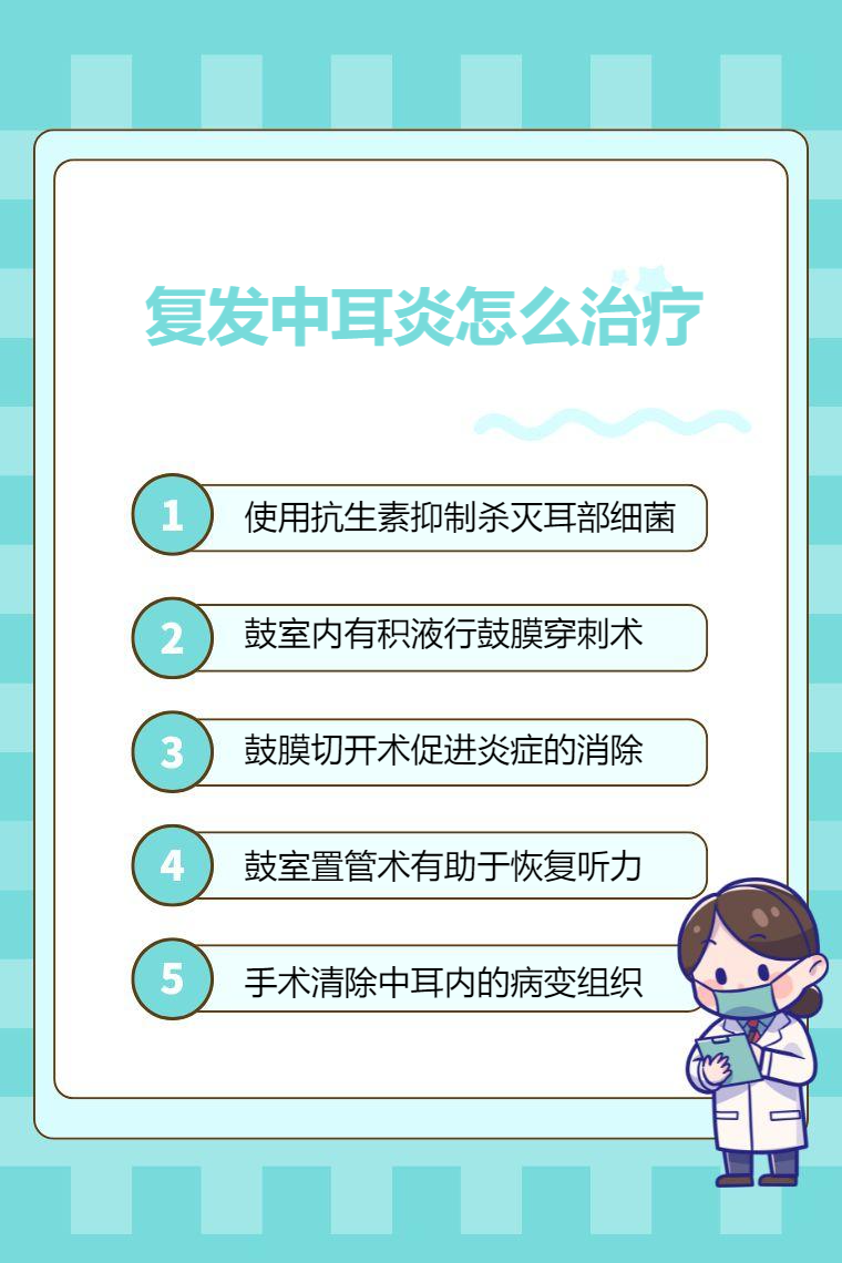 复发中耳炎的治疗方法主要有药物治疗、鼓膜穿刺术、鼓膜切开术、鼓室置管术、手术治疗等。