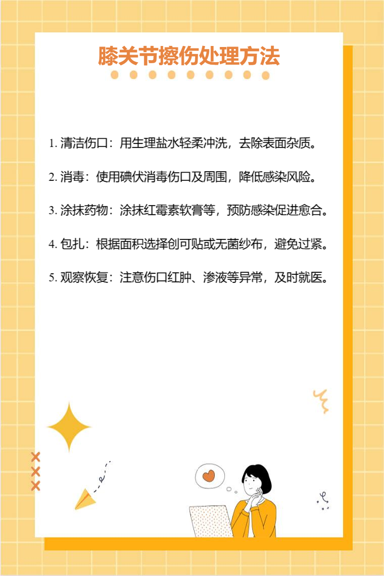 膝关节擦伤处理方法包括清洁伤口、消毒、涂抹药物、包扎、观察恢复等。