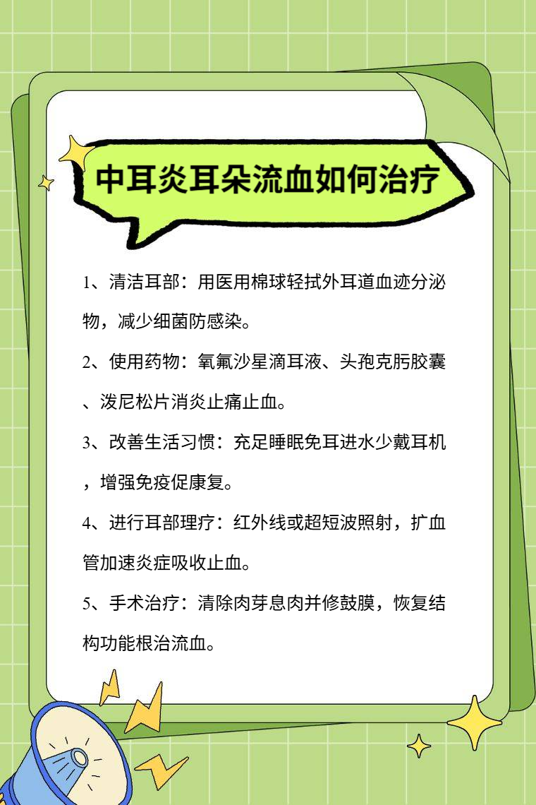 中耳炎耳朵流血可通过清洁耳部、使用药物、改善生活习惯、进行耳部理疗、手术治疗等方法来应对。