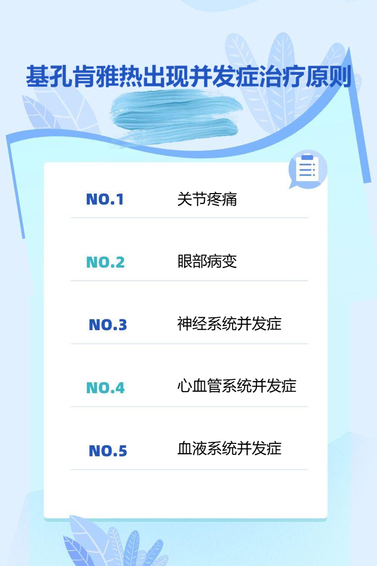 1. 关节疼痛:这是基孔肯雅热较为常见的并发症。治疗原则主要是缓解疼痛症状,可使用非甾体抗炎药,根据疼痛程度选择合适药物及剂量,同时配合物理治疗,如热敷、按摩等,促进局部血液循环,减轻关节炎症反应,帮助患者恢复关节功能,提高生活质量。