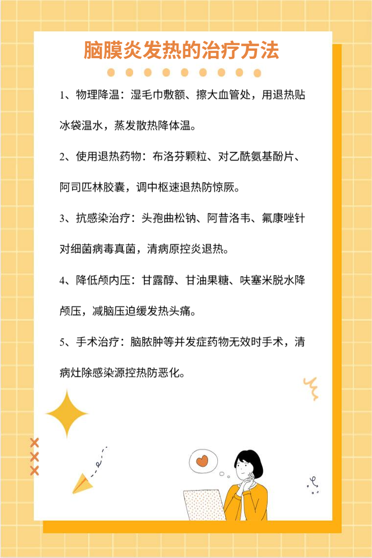 脑膜炎发热的治疗方法主要有物理降温、使用退热药物、抗感染治疗、降低颅内压、手术治疗等。