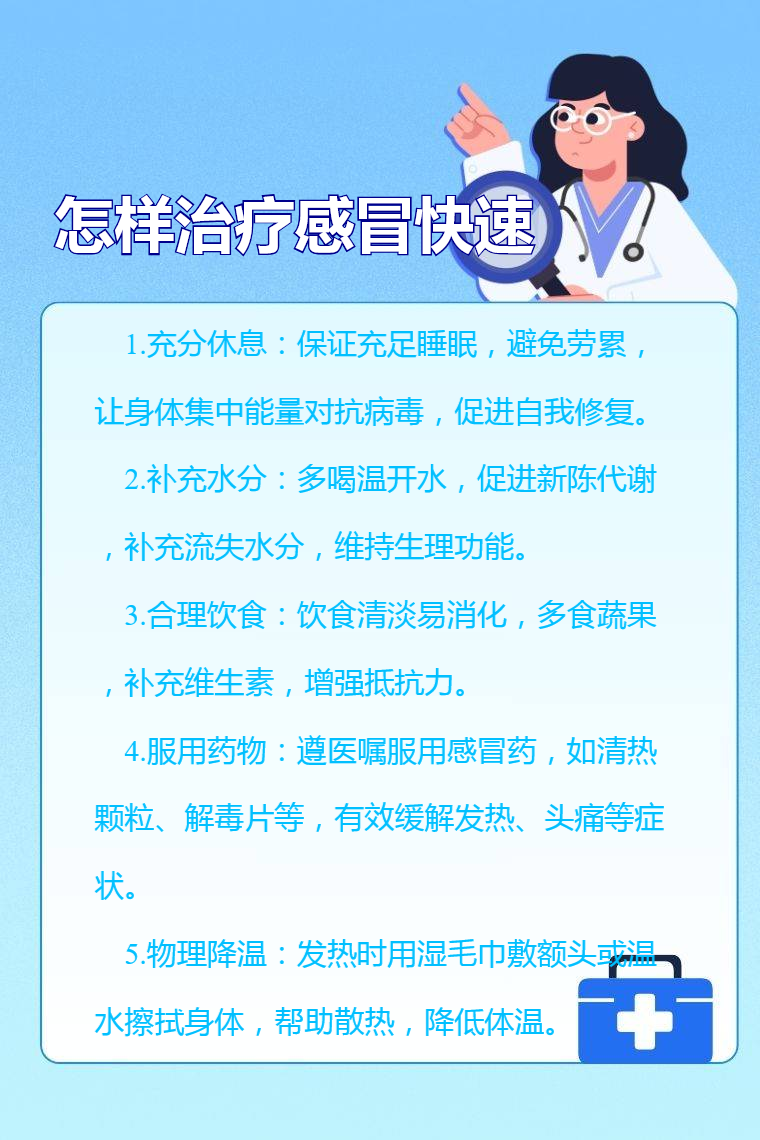 治疗感冒快速的方法有休息、补充水分、合理饮食、服用药物、物理降温等。