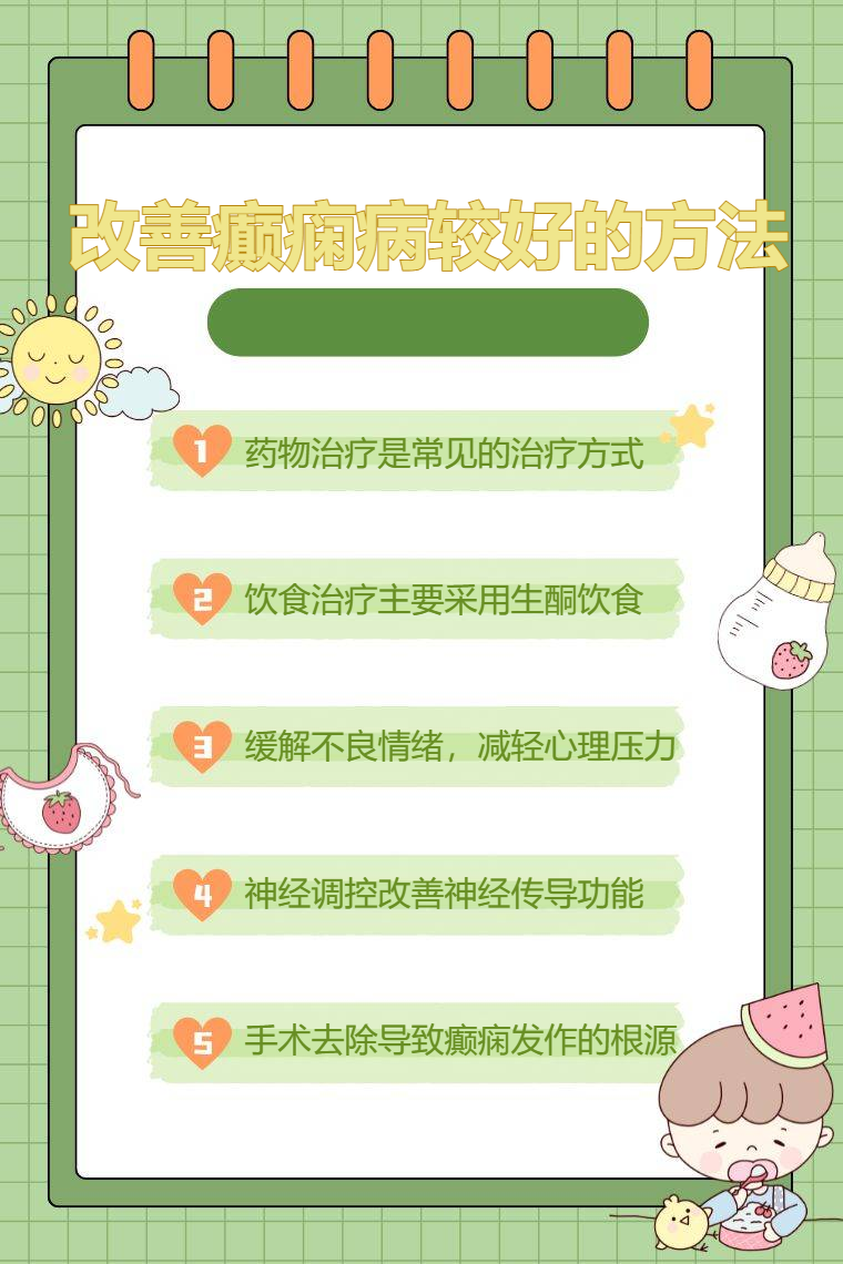 改善癫痫病较好的方法有药物治疗、饮食治疗、心理治疗、神经调控治疗、手术治疗等。