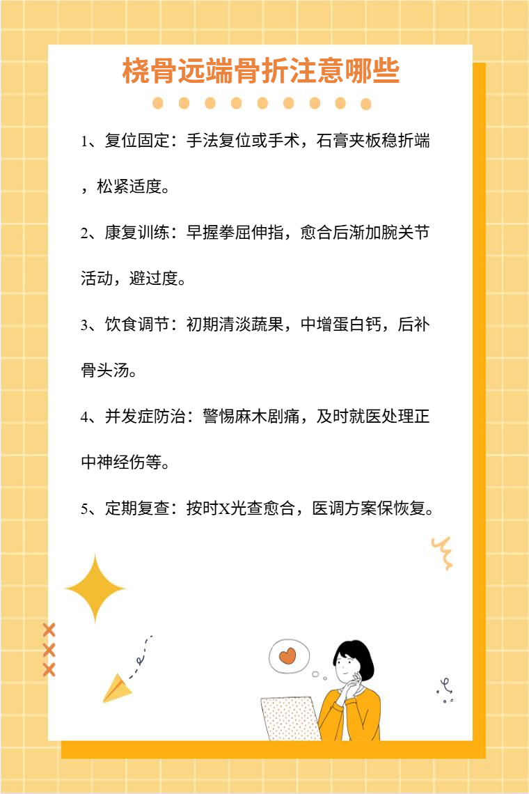 桡骨远端骨折需注意复位固定、康复训练、饮食调节、并发症防治、定期复查等。