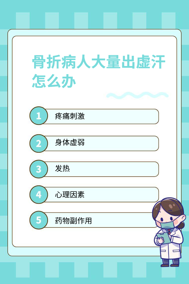骨折病人大量出虚汗可能由疼痛刺激、身体虚弱、发热、心理因素、药物副作用等情况导致。