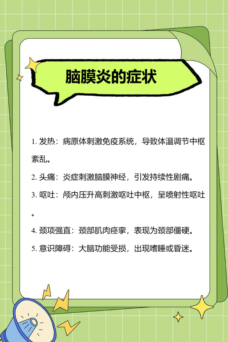 1. 发热:脑膜炎通常由病原体感染引发,病原体及其毒素会刺激人体免疫系统,导致体温调节中枢紊乱,进而引起发热症状,体温可高达38℃甚至更高,发热程度和持续时间因个体差异和感染病原体不同而有所区别。
