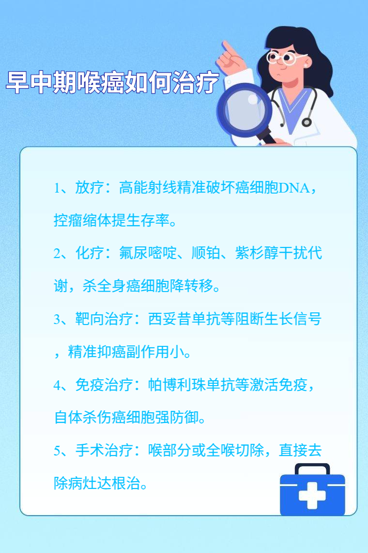 早中期喉癌的治疗方法主要有放疗、化疗、靶向治疗、免疫治疗、手术治疗等。