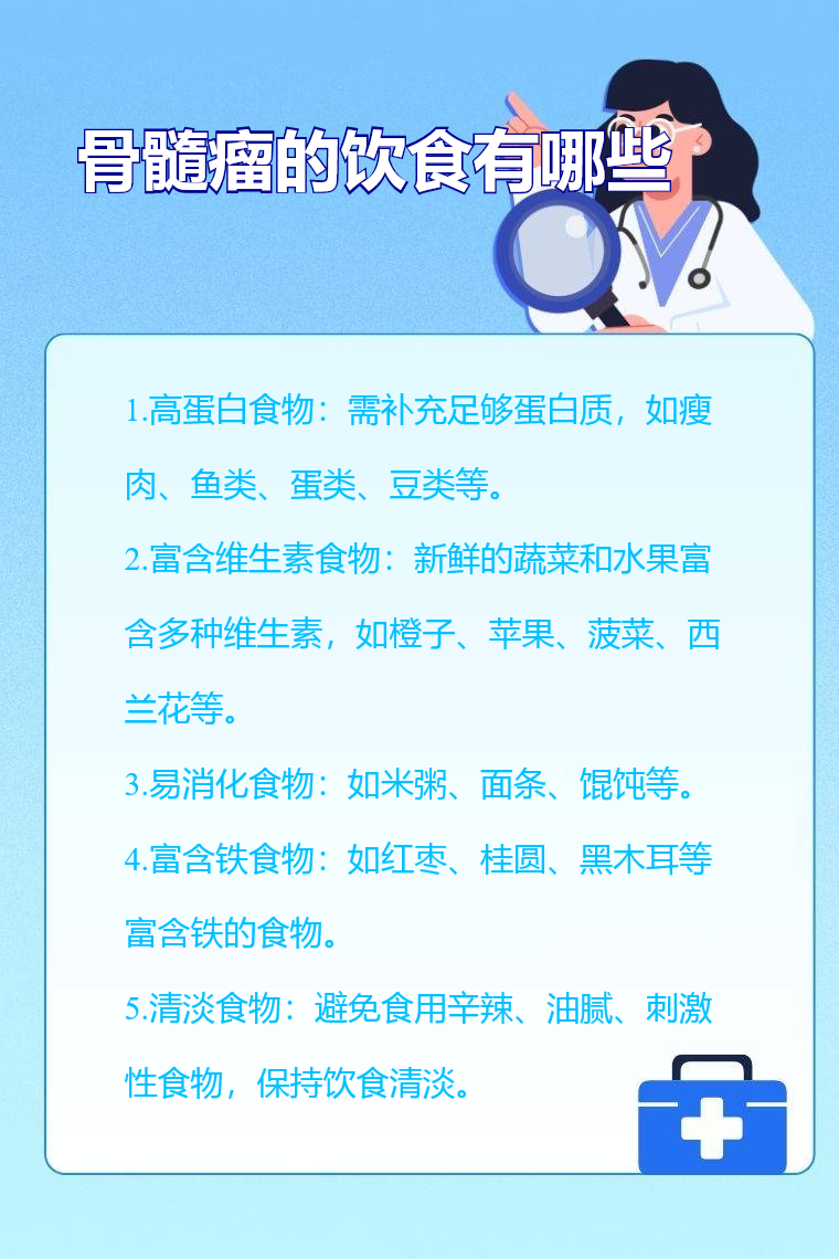 骨髓瘤患者的饮食包括高蛋白食物、富含维生素食物、易消化食物、富含铁食物、清淡食物等。