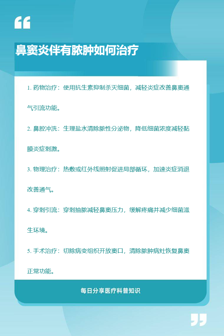 鼻窦炎伴有脓肿的治疗方法主要有药物治疗、鼻腔冲洗、物理治疗、穿刺引流、手术治疗等。