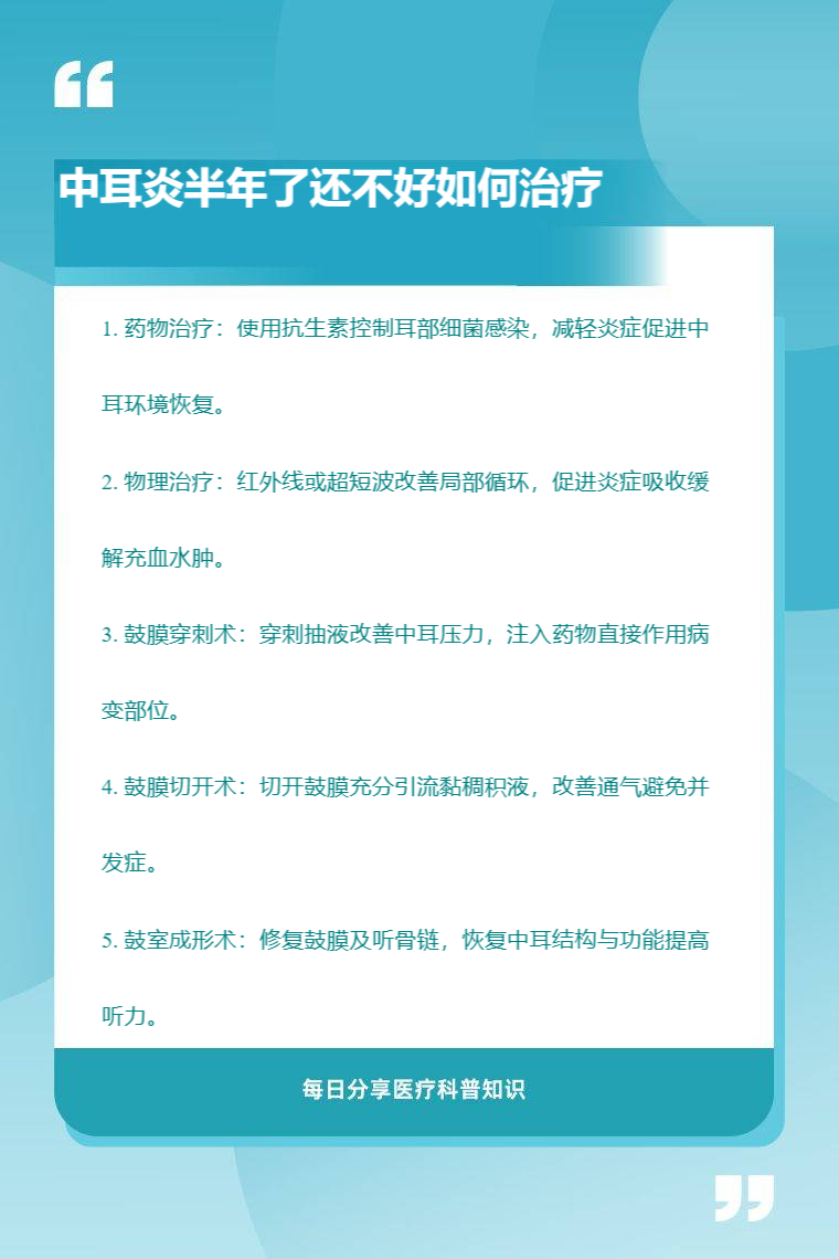 中耳炎半年未愈可通过药物治疗、物理治疗、鼓膜穿刺术、鼓膜切开术、鼓室成形术等方法治疗。