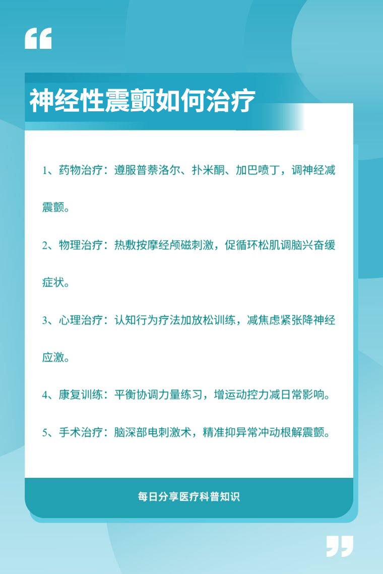 神经性震颤的治疗方法有药物治疗、物理治疗、心理治疗、康复训练、手术治疗等。