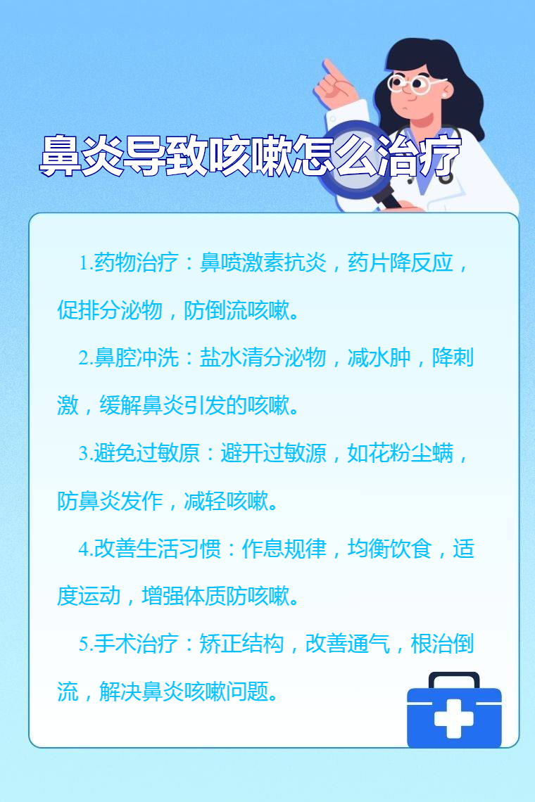 鼻炎导致咳嗽可通过药物治疗、鼻腔冲洗、避免过敏原、改善生活习惯、手术治疗等方法来缓解。