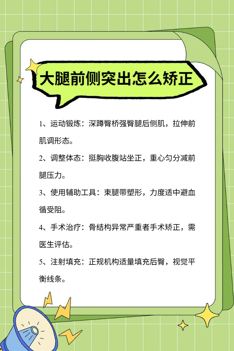 大腿前侧突出可通过运动锻炼、调整体态、使用辅助工具、手术治疗、注射填充等方法矫正。