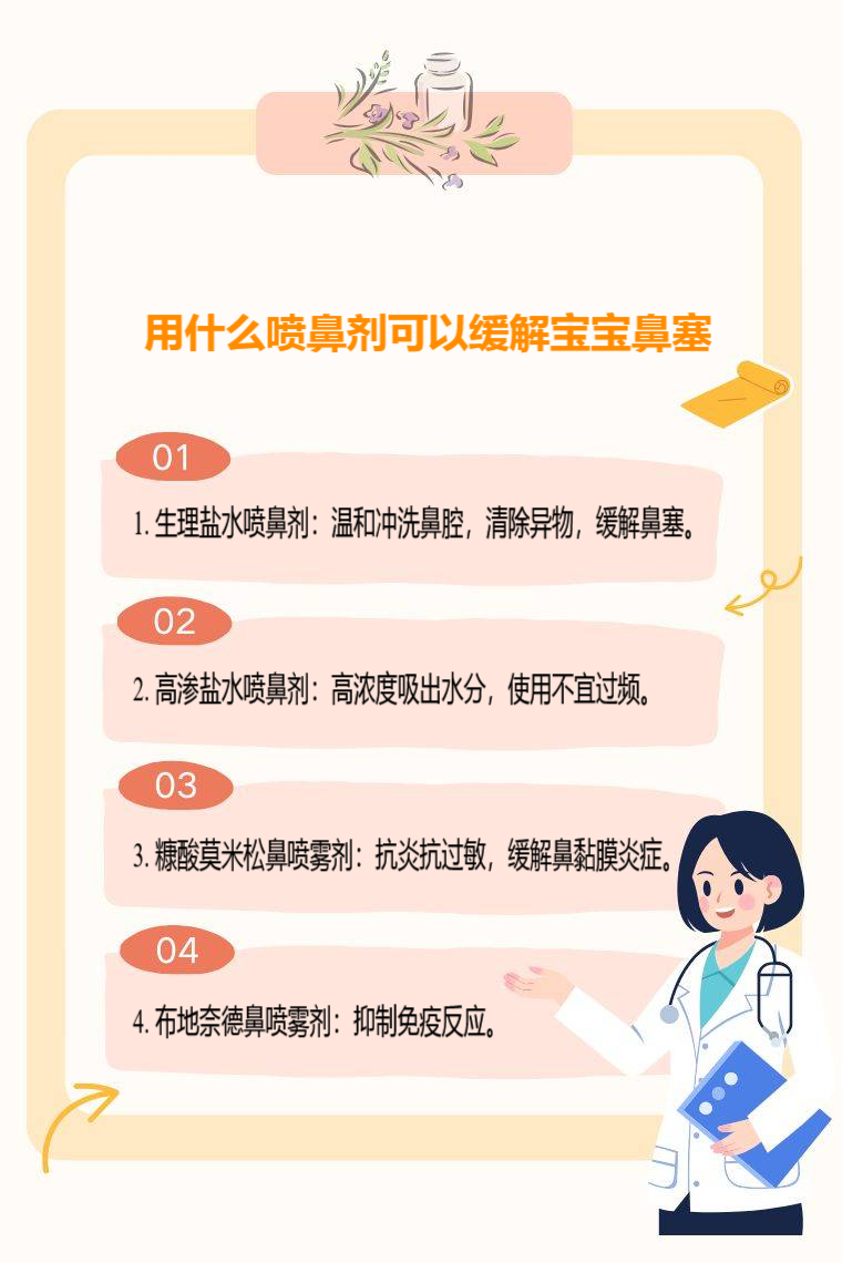 生理盐水喷鼻剂、高渗盐水喷鼻剂、糠酸莫米松鼻喷雾剂、布地奈德鼻喷雾剂等可缓解宝宝鼻塞。