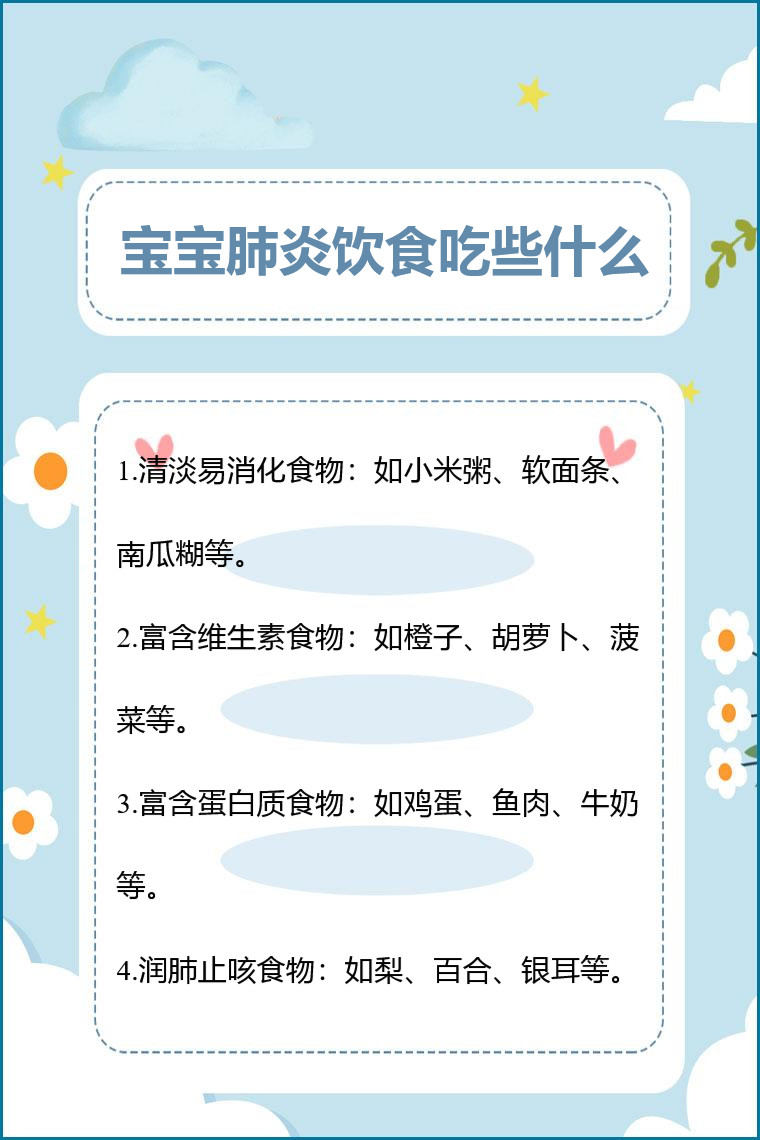 宝宝肺炎时饮食可选择清淡易消化食物、富含维生素食物、富含蛋白质食物、润肺止咳食物等。