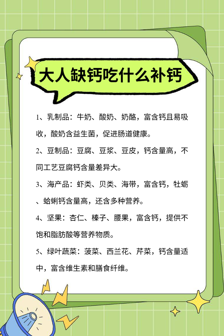 大人缺钙可通过食用乳制品、豆制品、海产品、坚果、绿叶蔬菜等补钙。