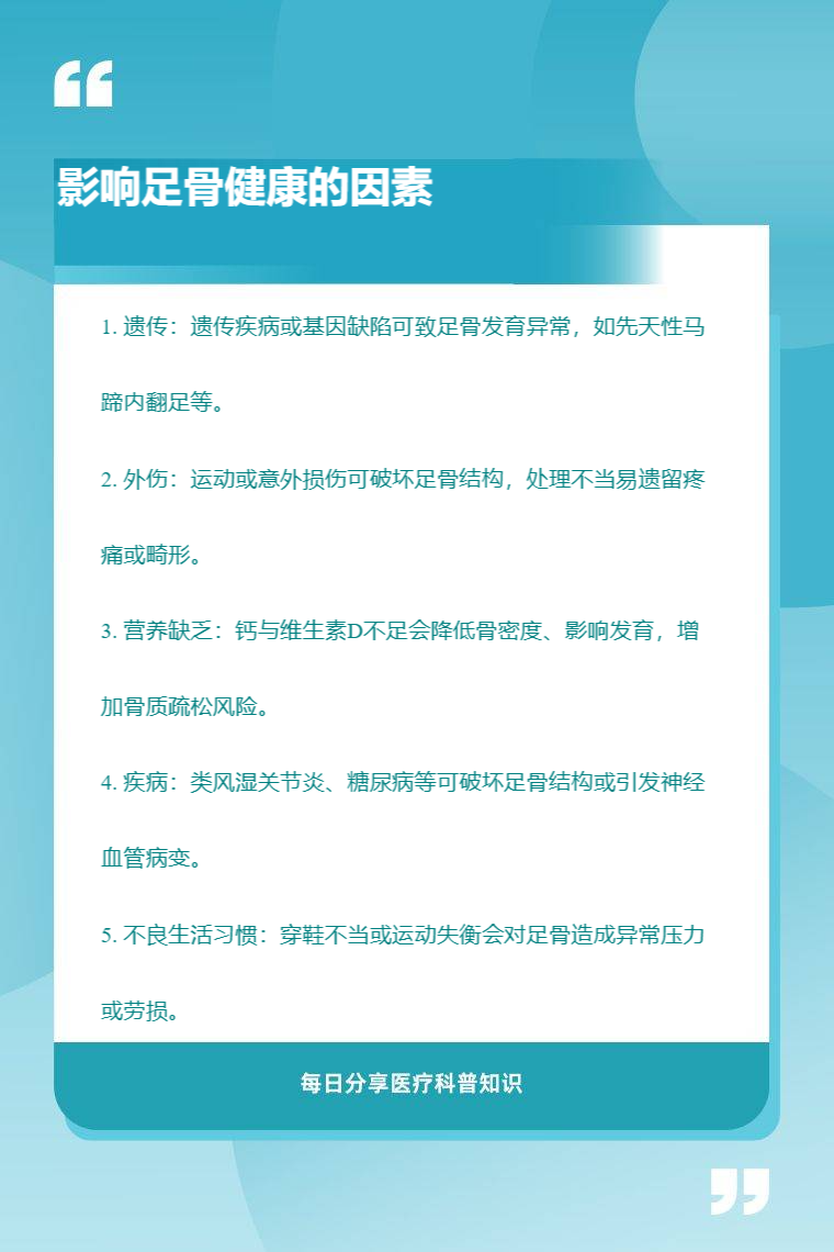 影响足骨健康的因素有遗传、外伤、营养缺乏、疾病、不良生活习惯等。