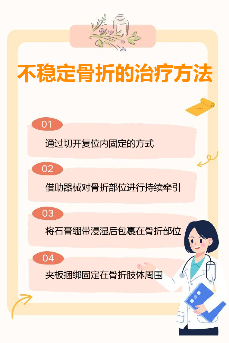 不稳定骨折的治疗方法有手术治疗、牵引治疗、石膏固定、夹板固定等。
