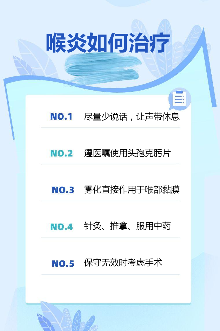 喉炎的治疗方法主要有一般治疗、药物治疗、雾化吸入治疗、中医治疗、手术治疗等。