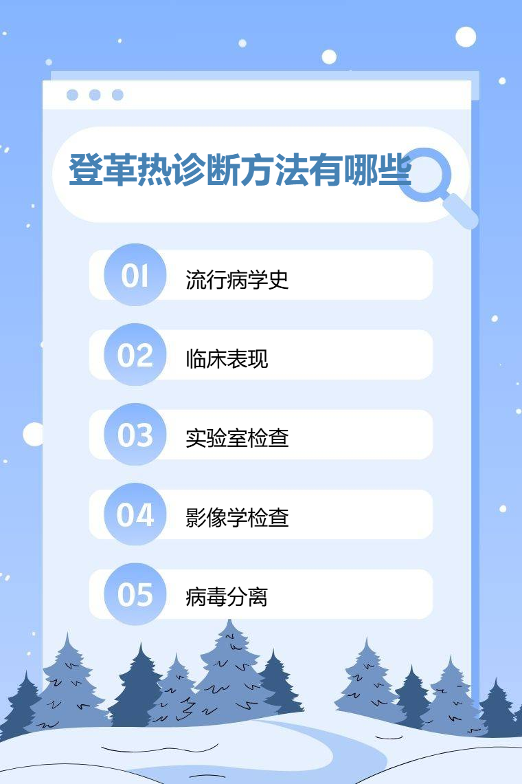 登革热的诊断方法有流行病学史、临床表现、实验室检查、影像学检查、病毒分离等。