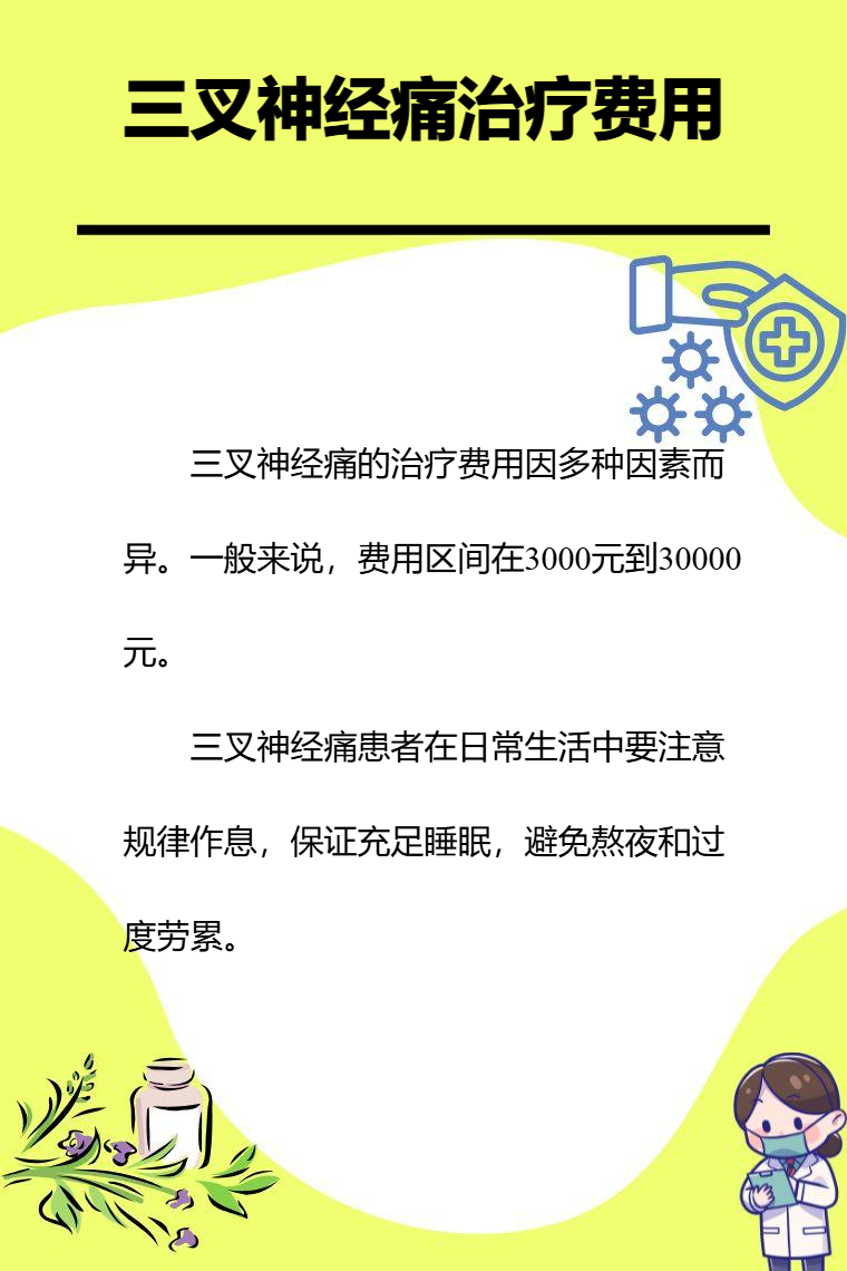 三叉神经痛的治疗费用因多种因素而异。一般来说,费用区间在3000元到30000元。影响费用的因素主要有治疗方式、病情严重程度、用药情况、检查项目 等。