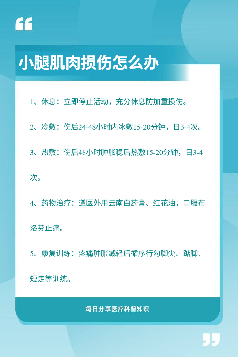 小腿肌肉损伤可通过休息、冷敷、热敷、药物治疗、康复训练等处理。