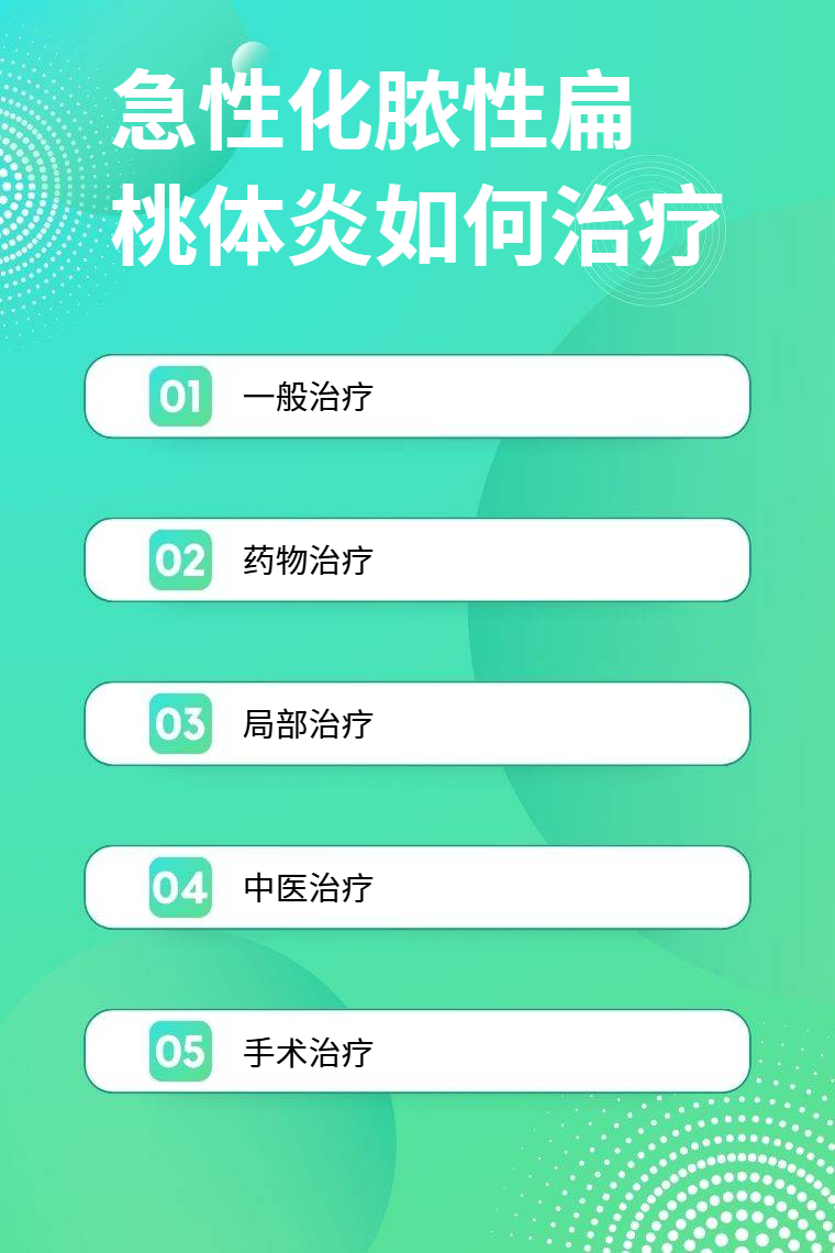 急性化脓性扁桃体炎的治疗方法主要有一般治疗、药物治疗、局部治疗、中医治疗、手术治疗等。