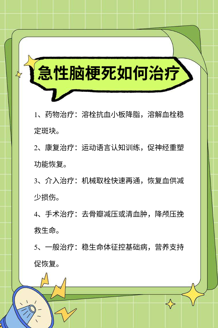 急性脑梗死的治疗方法主要有药物治疗、康复治疗、介入治疗、手术治疗、一般治疗等。