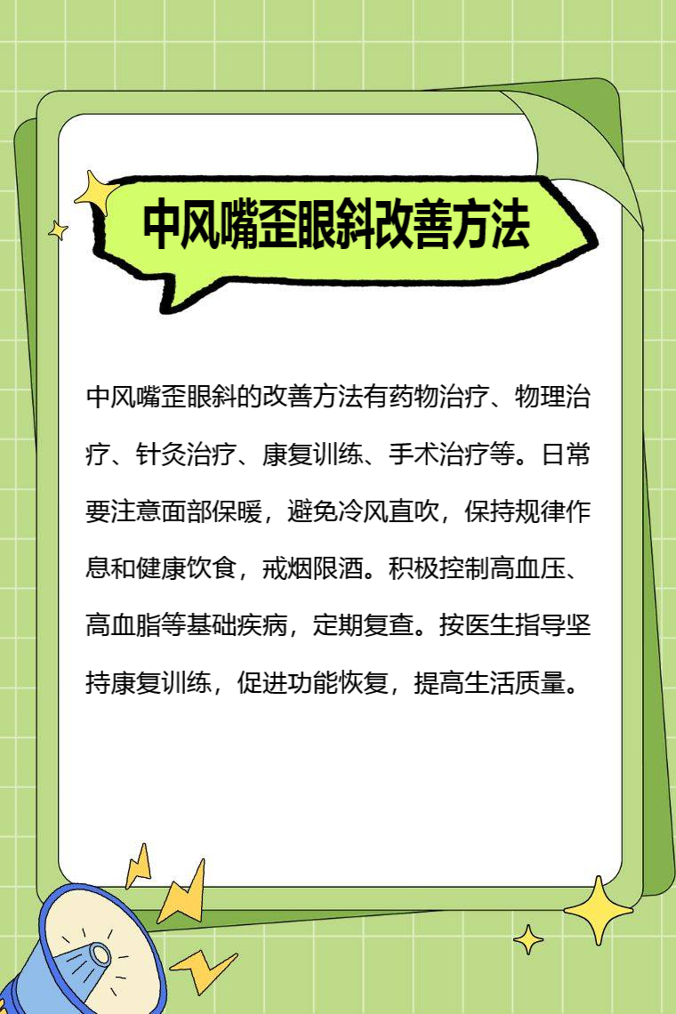 中风嘴歪眼斜的改善方法有药物治疗、物理治疗、针灸治疗、康复训练、手术治疗等。