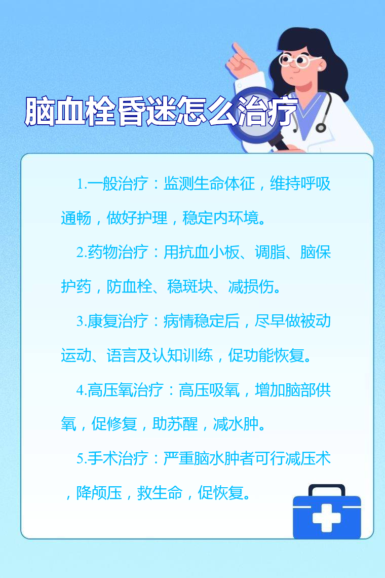 脑血栓昏迷的治疗方法主要有一般治疗、药物治疗、康复治疗、高压氧治疗、手术治疗等。