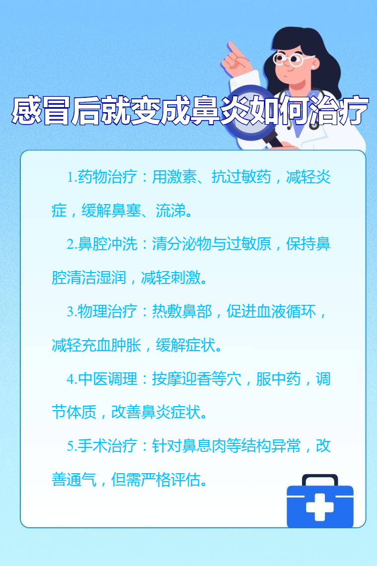 感冒后引发鼻炎可通过药物治疗、鼻腔冲洗、物理治疗、中医调理、手术治疗等方法应对。