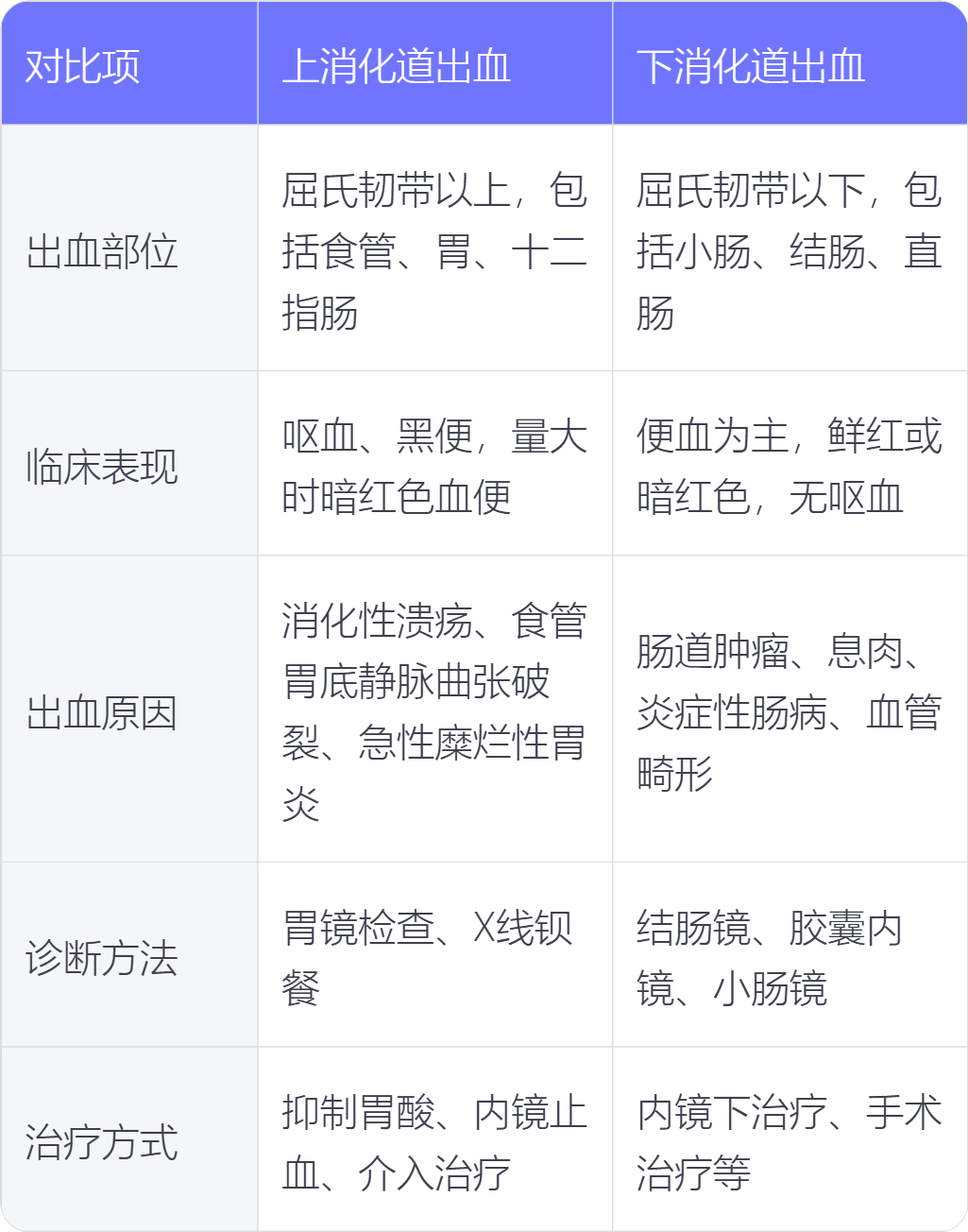 上消化道出血与下消化道出血在出血部位、临床表现、出血原因、诊断方法、治疗方式上存在不同。