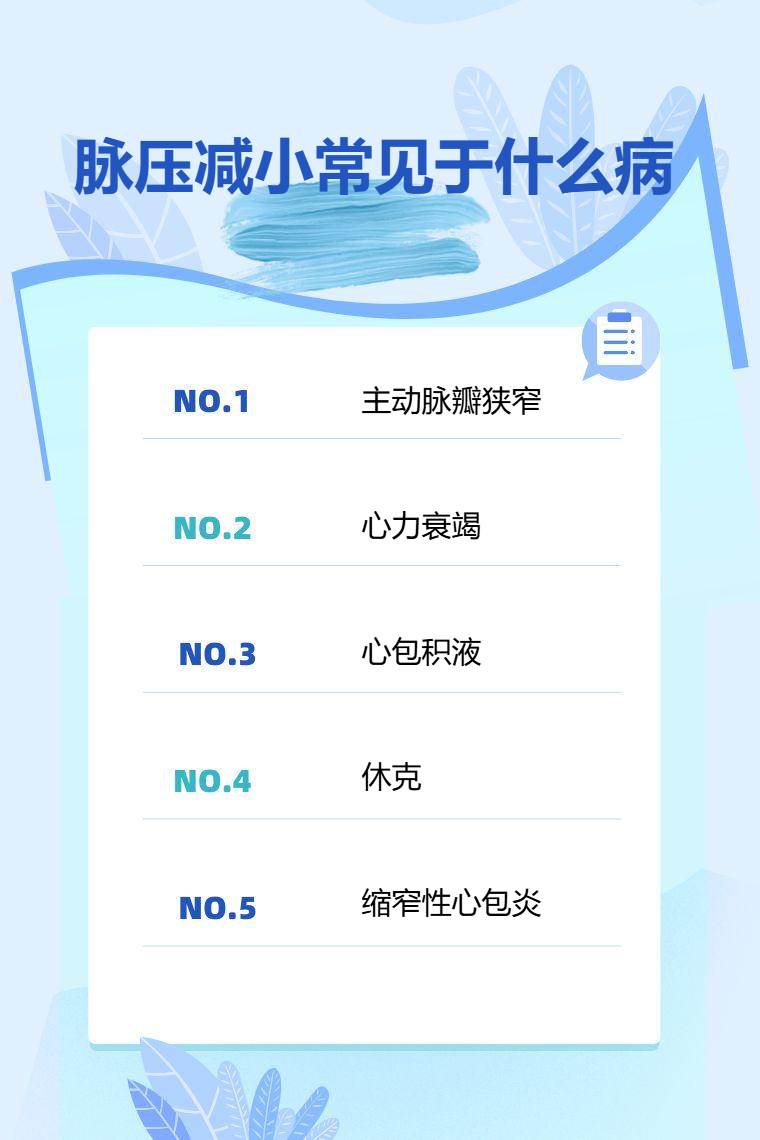 脉压减小常见于主动脉瓣狭窄、心力衰竭、心包积液、休克、缩窄性心包炎等。
