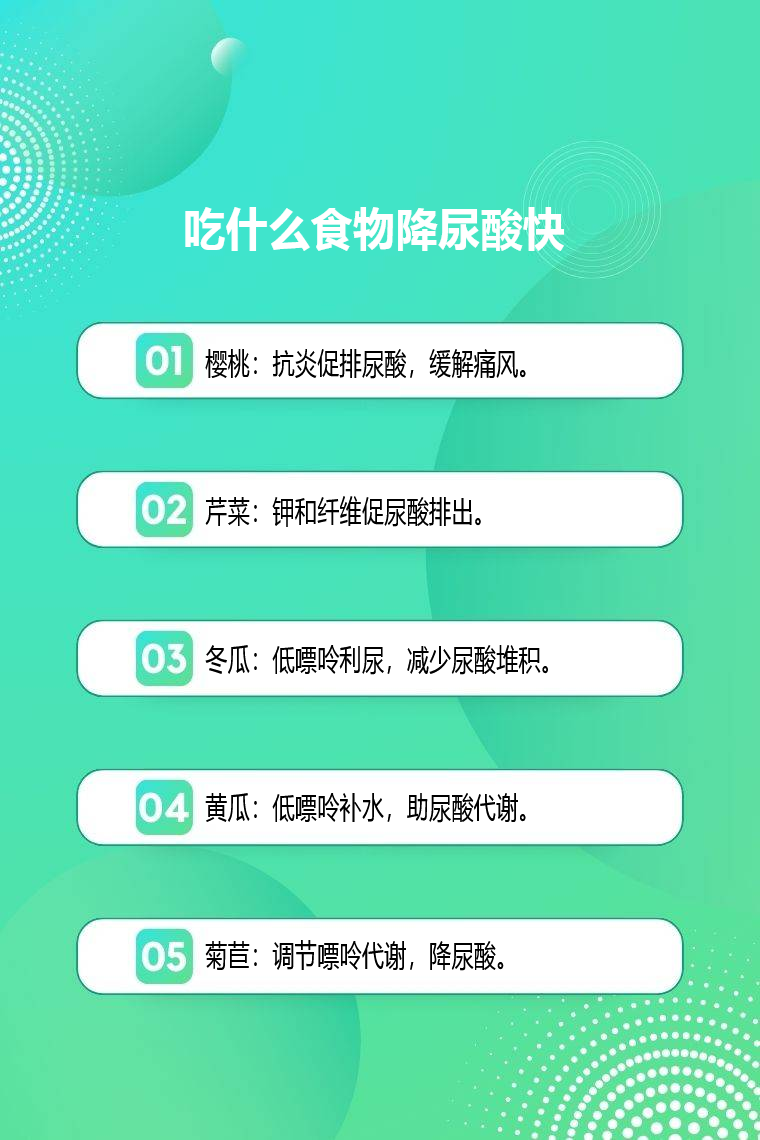 樱桃、芹菜、冬瓜、黄瓜、菊苣等都是有助于降尿酸的食物。