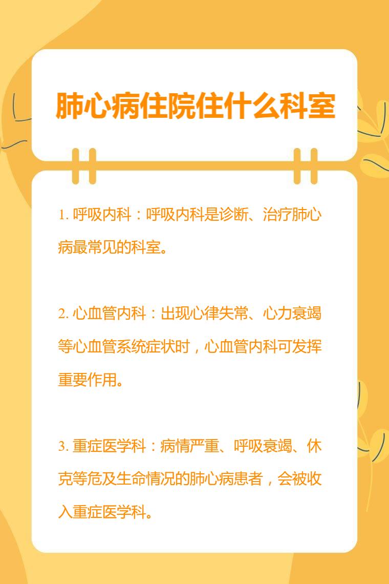 肺心病住院可选择呼吸内科、心血管内科、重症医学科等。