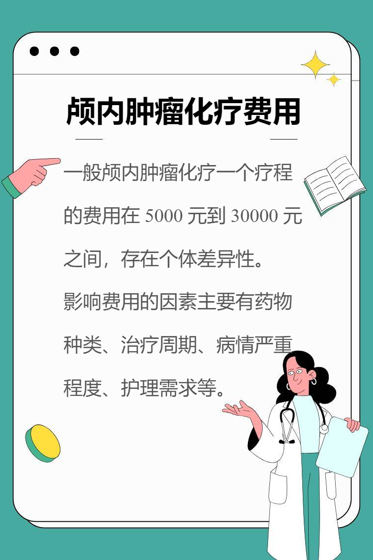 颅内肿瘤化疗费用因多种因素而异。一般来说,颅内肿瘤化疗一个疗程的费用在 5000 元到 30000 元之间,存在个体差异性。影响费用的因素主要有药物种类、治疗周期、病情严重程度、护理需求等。