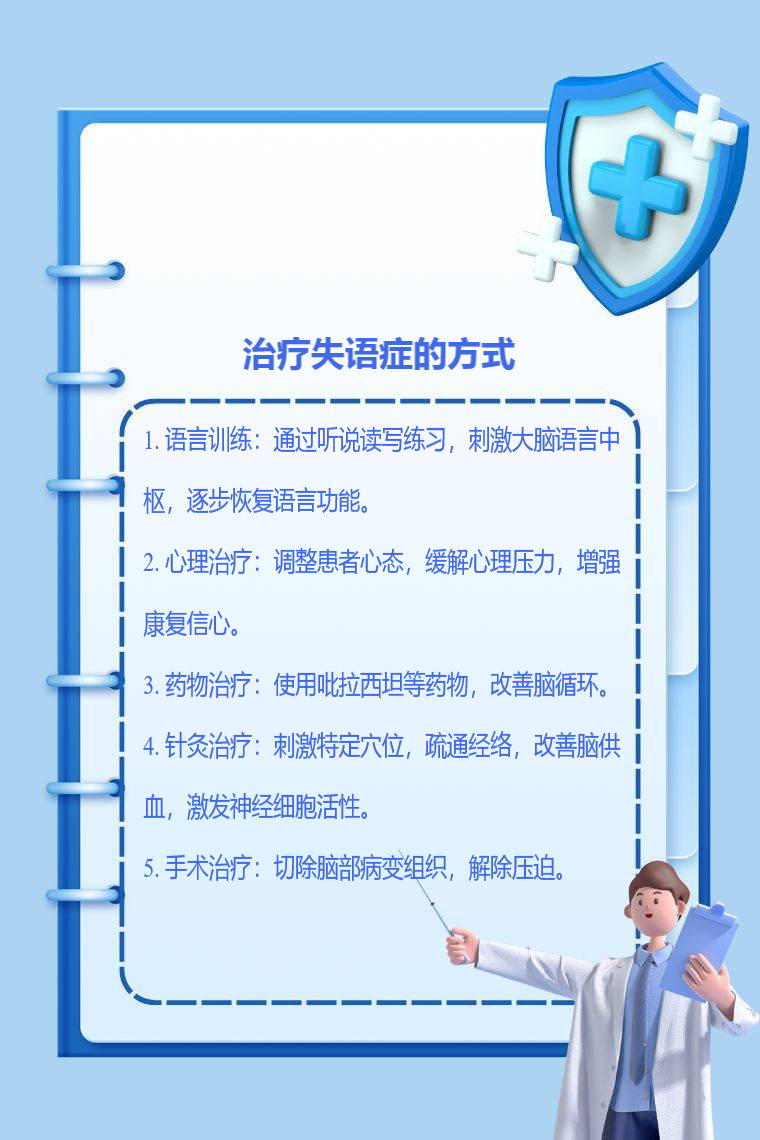 治疗失语症的方式有语言训练、心理治疗、药物治疗、针灸治疗、手术治疗等。