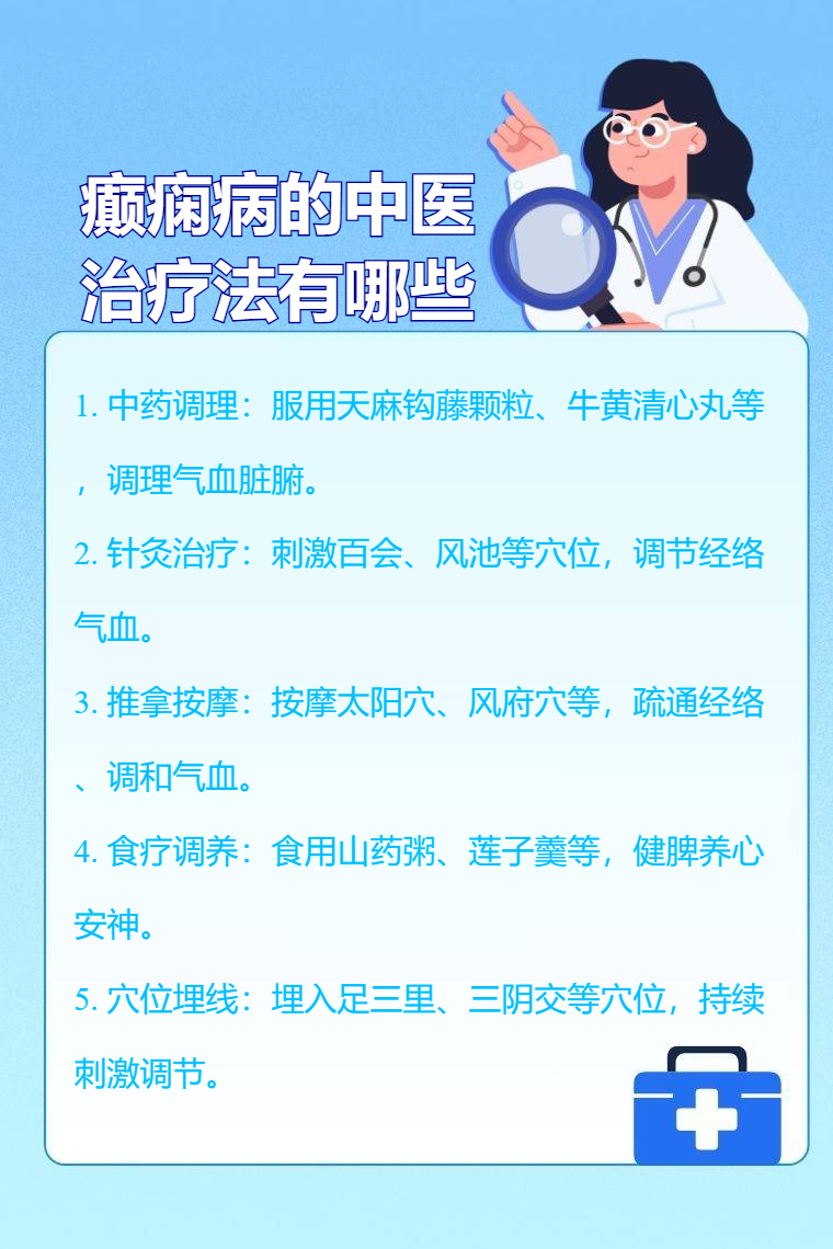 癫痫病的中医治疗法有中药调理、针灸治疗、推拿按摩、食疗调养、穴位埋线等。