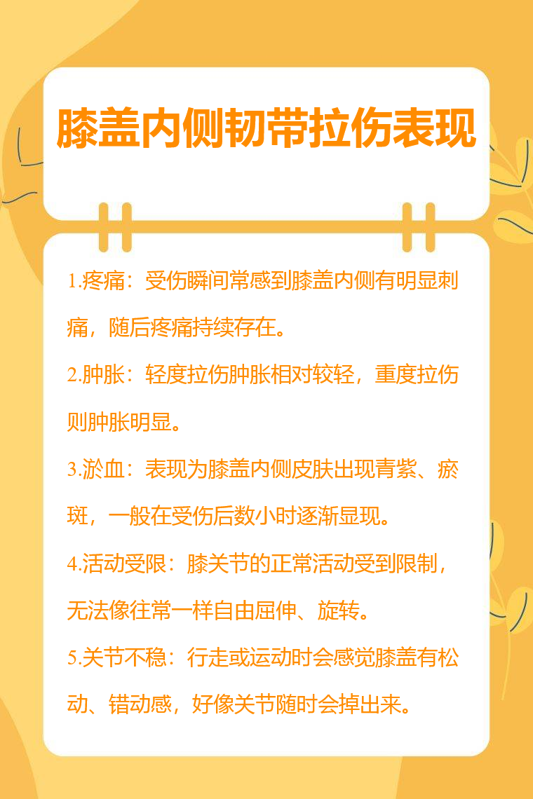 膝盖内侧韧带拉伤表现有疼痛、肿胀、淤血、活动受限、关节不稳等。