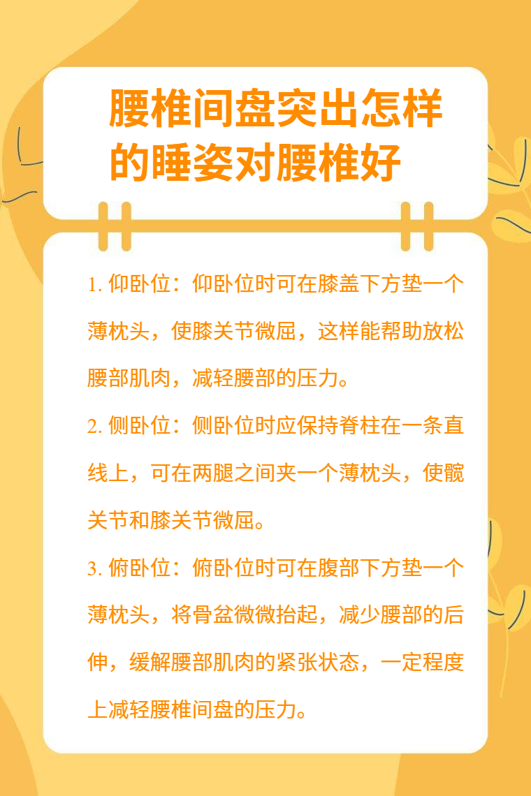 腰椎间盘突出患者在选择睡姿时,应根据自身感受进行调整。同时,日常要注意避免腰部过度劳累和受寒,适当进行腰部康复锻炼。若症状严重,需及时就医,严格遵循医生的治疗建议 。