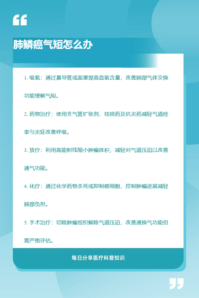 肺鳞癌气短可通过吸氧、药物治疗、放疗、化疗、手术治疗等方法缓解。