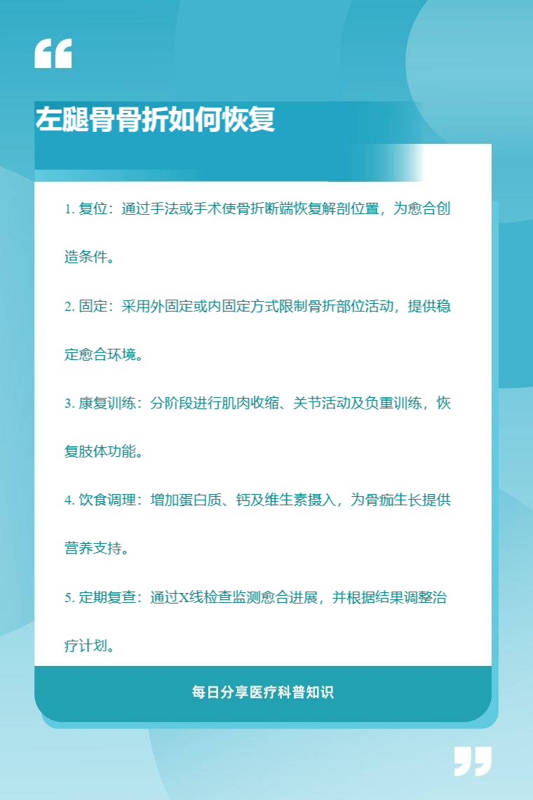左腿骨骨折恢复是个长期过程,要严格按照医生制定的方案进行治疗和康复训练。日常生活中注意休息,避免过度劳累和二次损伤。保持积极心态,相信身体会逐渐恢复健康。