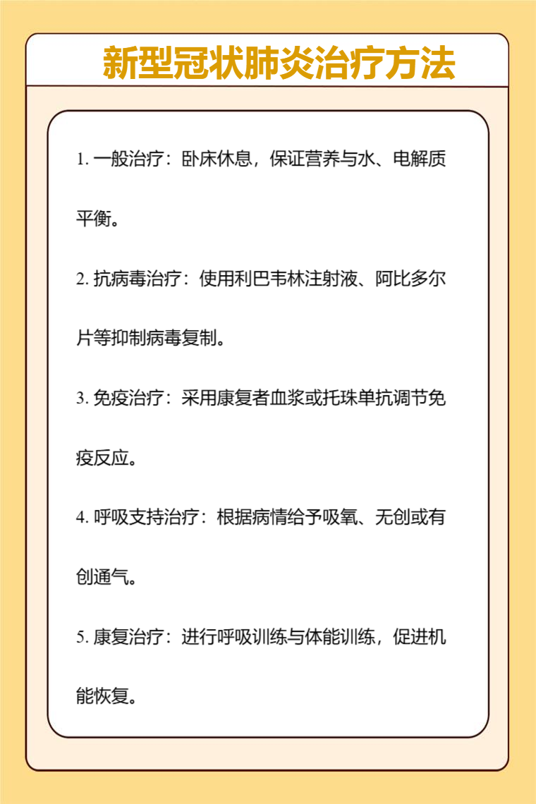 新型冠状肺炎的治疗方法主要有一般治疗、抗病毒治疗、免疫治疗、呼吸支持治疗、康复治疗等。