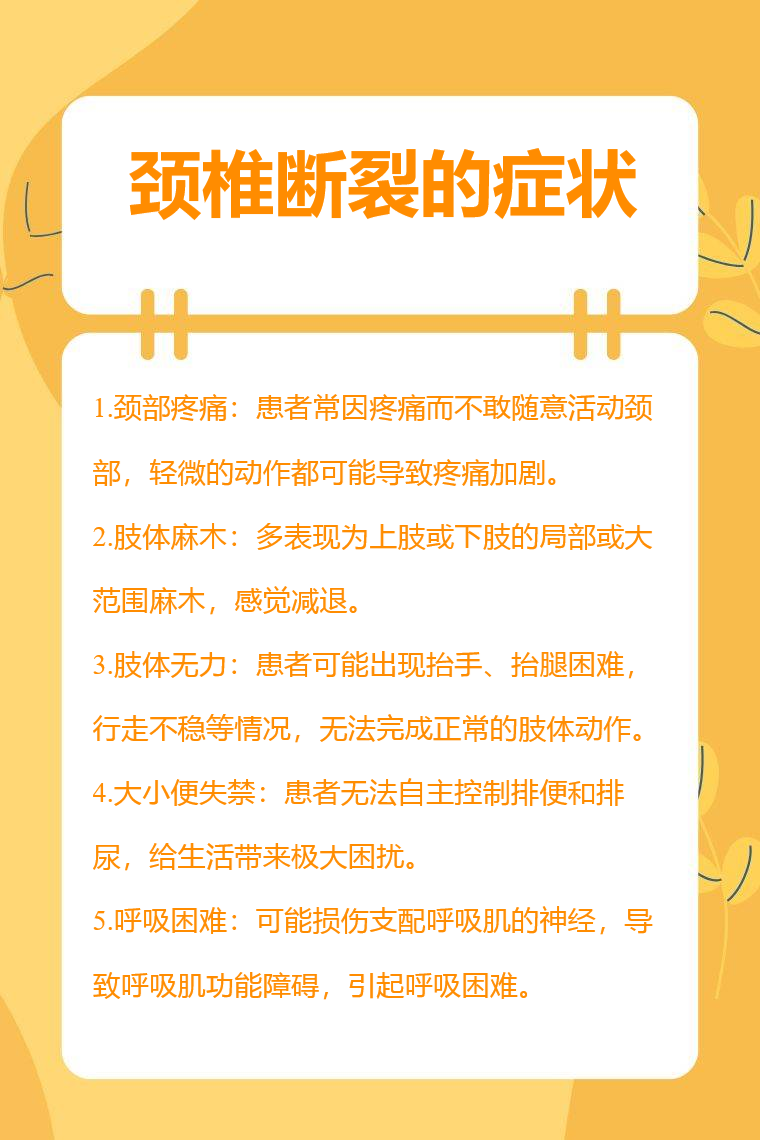 颈椎断裂的症状有颈部疼痛、肢体麻木、肢体无力、大小便失禁、呼吸困难等。