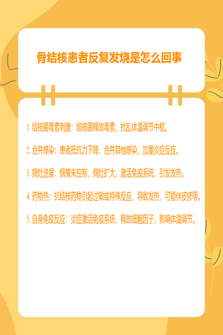骨结核患者反复发烧常见原因有结核菌毒素刺激、合并感染、病灶进展、药物热、自身免疫反应等。